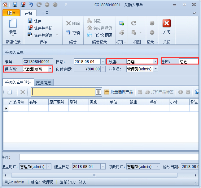 1、點擊【庫存管理】→【采購入庫單】→點擊菜單欄中“新建”進入采購入庫單中,首先選擇購入的門店和需要存放這批產品的倉庫,然后填入產品采購的供應商,如圖: