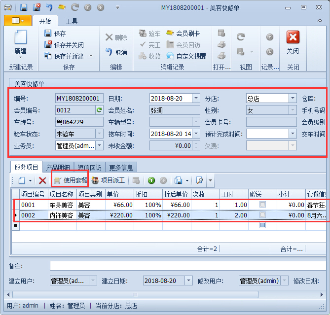 ②為會員開完美容快修單并使用套餐內的服務,軟件將自動扣減服務數量,如圖:
