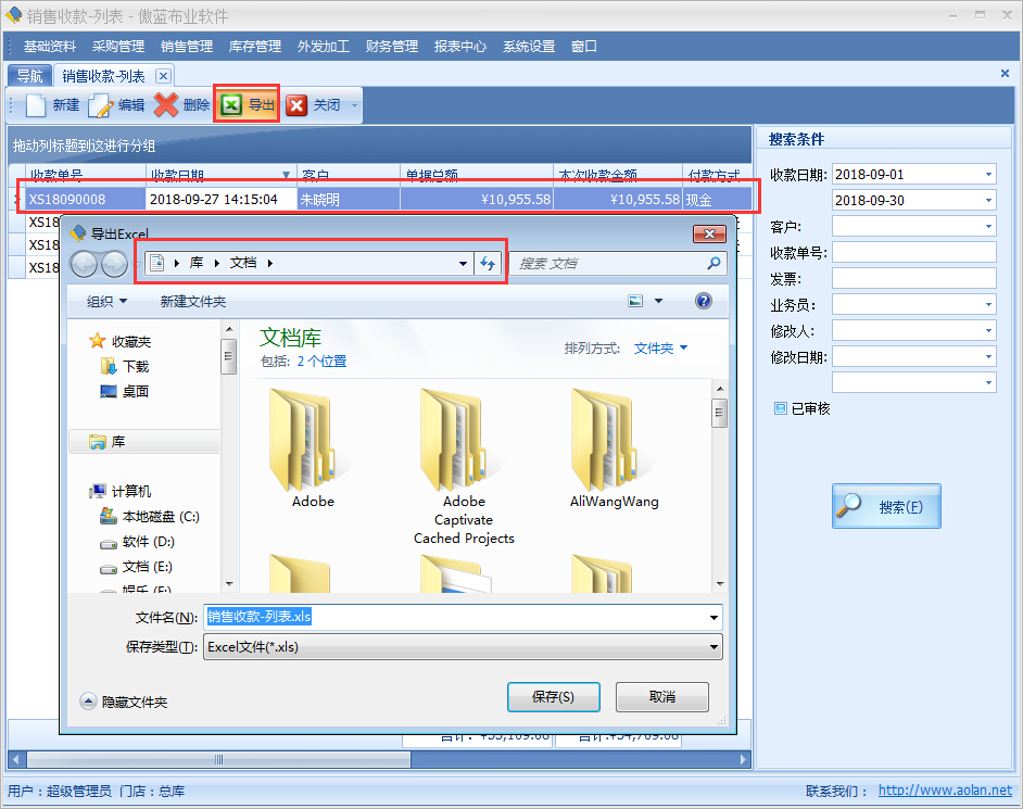 導出是把當前列表中所有的記錄以 Excel 表格方式導出。在銷售付款列表界面上,點擊【導出】按鈕。