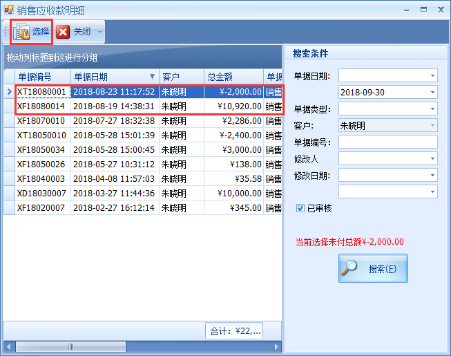 如需要對銷售付款中某一條數據進行刪除的,通過銷售付款列表界面,選中一條記錄。點擊【刪除】
