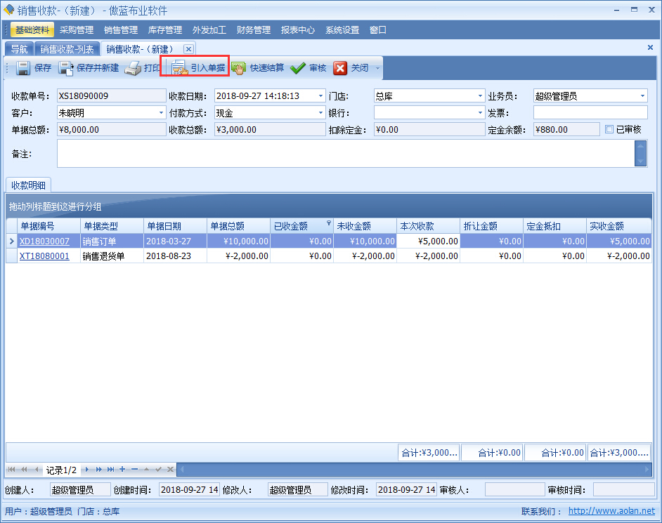 傲藍布匹銷售管理系統銷售付款-引入單據