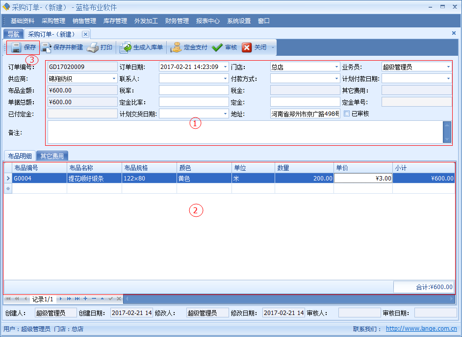 傲藍布行管理系統采購訂單管理,采購訂單主要是用于,采購時按照所需要的布品,進行登記。