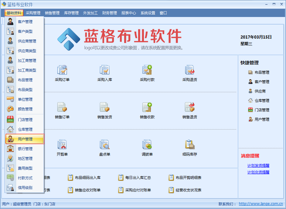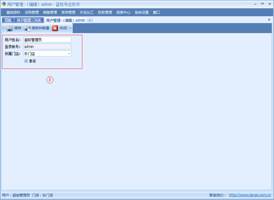 傲藍布匹管理系統用戶管理功能主要是對于布行管理系統操作者的管理,可以自行添加使用軟件系統的用戶或禁止指定用戶,被禁止的用戶不能登錄使用傲藍布行管理系統。