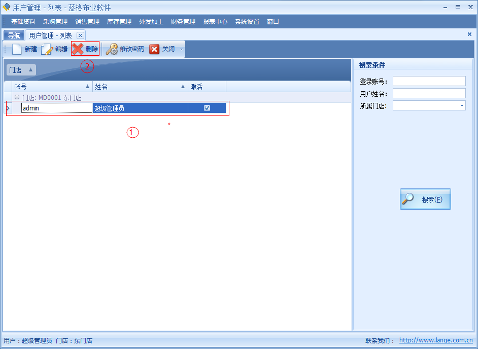 如需要對用戶進行刪除的,通過用戶管理列表界面,選中一條記錄。點擊【刪除】按鈕,刪除即可。