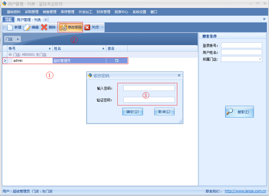 如需要對用戶進行修改密碼的,通過用戶管理列表界面,選中一條記錄。點擊【更改密碼】按鈕,在