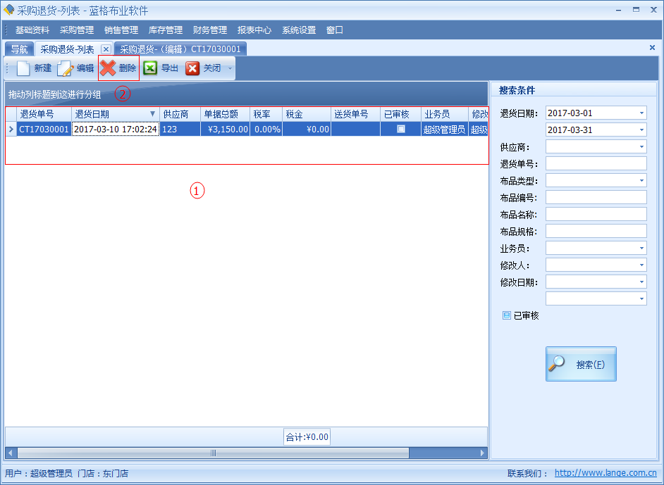 如需要對(duì)采購?fù)素浿心骋粭l數(shù)據(jù)進(jìn)行刪除的,通過采購?fù)素浟斜磉x中一條記錄點(diǎn)擊【刪除】按鈕,刪