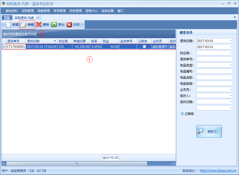 如需要對(duì)采購?fù)素浤骋粭l數(shù)據(jù)進(jìn)行修改的,通過采購?fù)素浟斜磉x中一條記錄點(diǎn)擊【編輯】按鈕,進(jìn)入