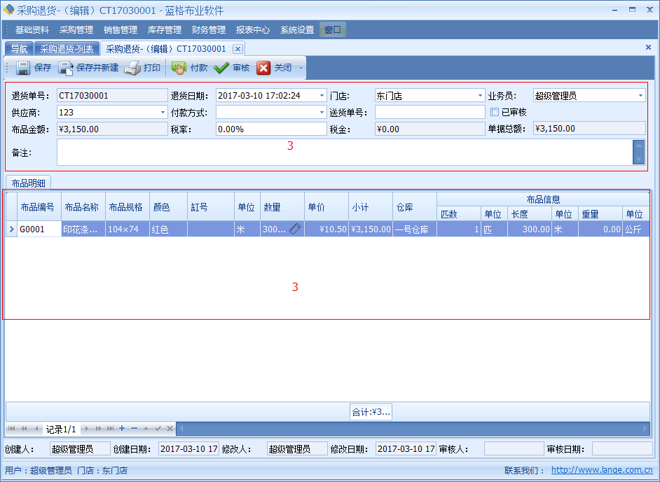 當(dāng)采購布品回來時(shí)發(fā)現(xiàn),布品中有破損、布品不對(duì)或者其他情況需要退貨給供應(yīng)商,并且取回來已經(jīng)支付給供應(yīng)商的布匹款項(xiàng)。傲藍(lán)好布業(yè)軟件中可以通過【采購?fù)素洝縼聿僮鳌2少復(fù)素泦螕?jù)包括退貨日期、要退貨的采購單、供應(yīng)商、倉庫、金額等信息。明細(xì)列表中包括單據(jù)要退貨的布品名稱、顏色、單位、數(shù)量、明細(xì)碼價(jià)格等詳細(xì)數(shù)據(jù)。
