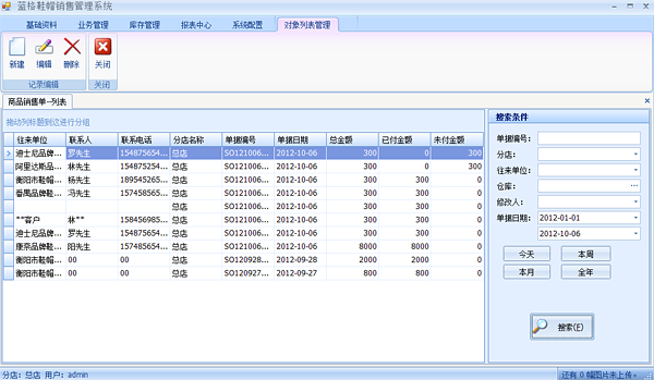 點(diǎn)擊【業(yè)務(wù)管理】->【銷(xiāo)售列表】, 打開(kāi)銷(xiāo)售單據(jù)列表界面,該界面可以進(jìn)行查詢,查詢相關(guān)銷(xiāo)售單的信息,雙擊該單據(jù)打開(kāi)銷(xiāo)售詳細(xì)信息界面。銷(xiāo)售單據(jù)列表界面包括編輯銷(xiāo)售單,刪除單據(jù)和建立新的單據(jù)三個(gè)功能。如下圖: