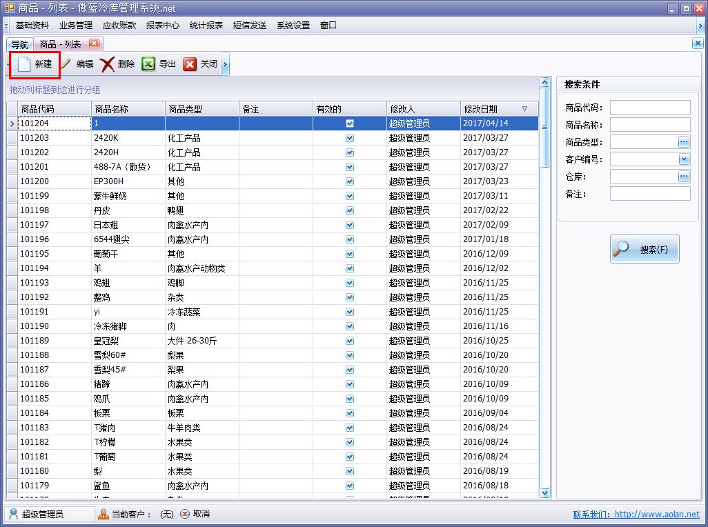 傲藍(lán)冷庫(kù)信息管理系統(tǒng)對(duì)于貨品資料的建檔管理,以便于業(yè)務(wù)操作時(shí)的選擇自動(dòng)生成,例如入庫(kù)單操作,選擇所要入庫(kù)的商品即可,免除了人為重新錄入的繁瑣。