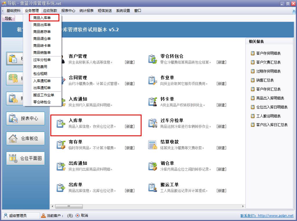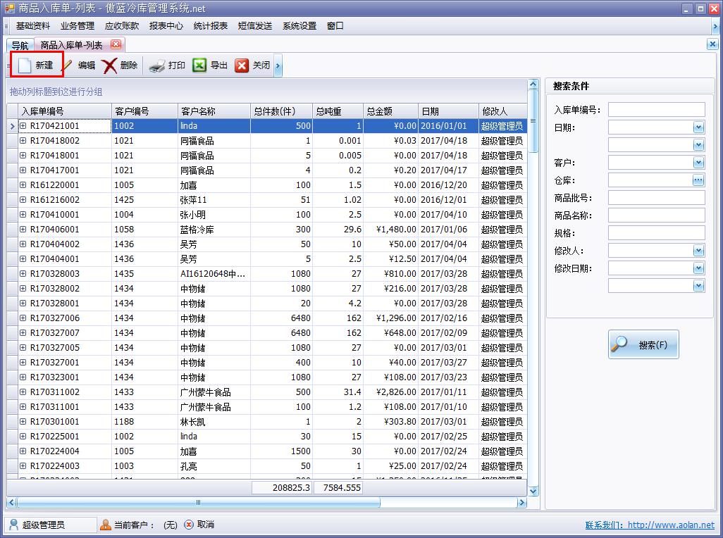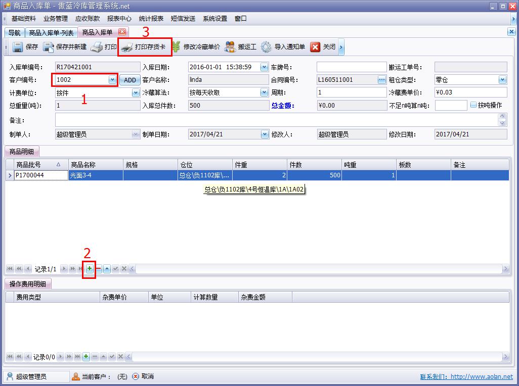 傲藍(lán)冷庫(kù)倉(cāng)儲(chǔ)管理軟件,商品入庫(kù)功能,系統(tǒng)可分倉(cāng)庫(kù),按照商品批號(hào)管理,自動(dòng)計(jì)算操作費(fèi)用。系統(tǒng)采用冷藏費(fèi)和操作費(fèi)分離計(jì)算的方式。