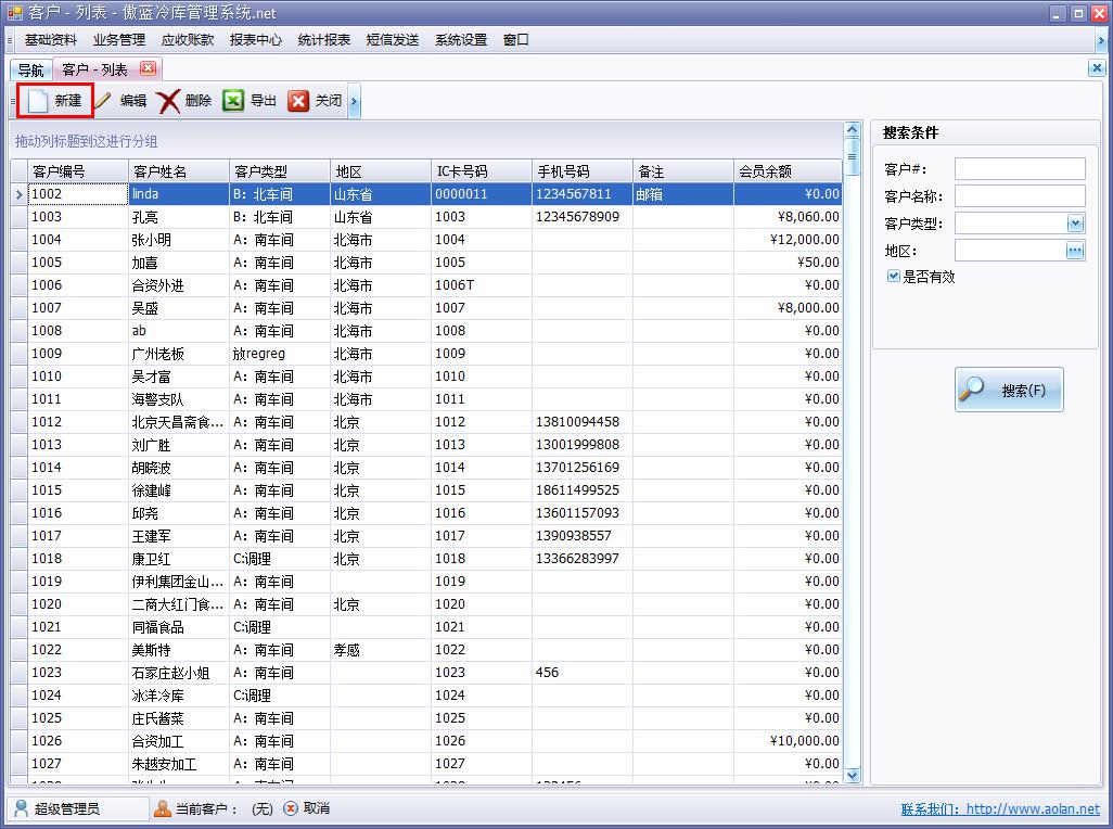 貨主資料管理是傲藍冷庫信息管理系統對于冷庫企業客戶資料進行管理的功能,例如:客戶類型、客戶信譽級別、客戶公司性質、客戶企業所在地區、客戶結算方式、結算使用的現金銀行等信息的管理。