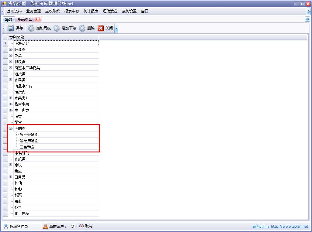例如冷庫企業同時具有儲存果品、蔬菜、速凍肉食品等,速凍肉食品又可細分為魚類、蝦 類、牛肉等不同的類型。貨品類型的細分,可以清晰客戶存儲的商品類型,也可以對應不同的商品,存儲在不一樣的冷庫倉庫中。貨品細分類型并有規律地擺放,符合不同倉庫的冷藏冷凍溫度的要求,實現了冷庫儲存信息的標準化管理。
