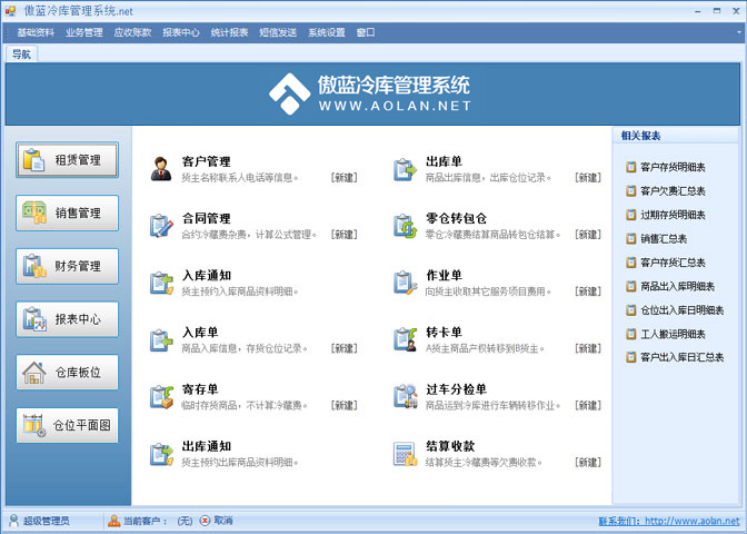 分店客戶端:分店電腦運行冷庫結算管理系統客戶端桌面軟件,具有網頁不可替代的操作的體驗和效率。傲藍冷庫結算管理系統精心設計了豐富的快捷方式,讓操作更快!OFFICE2007風格界面,時尚潮流!