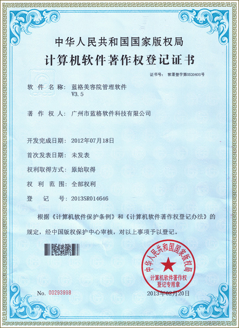 傲藍(lán)軟件認(rèn)定證書(shū) 美容管理軟件著作權(quán)證書(shū)