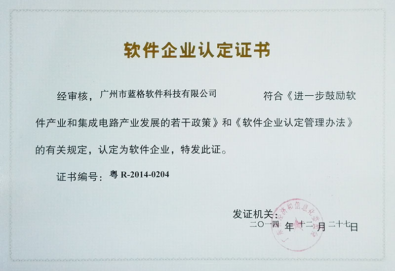 傲藍(lán)軟件企業(yè)認(rèn)定證書(shū)