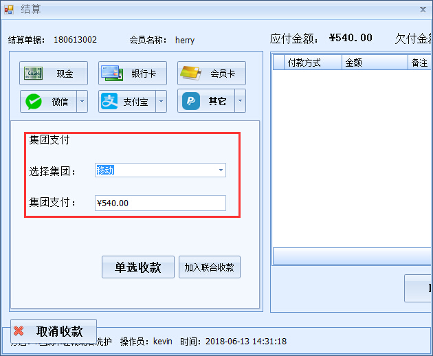 3、集團會員進店消費時,傲藍皮具養護店軟件會在收物開單結算時默認為集團支付,直接收款結算即可,如圖:
