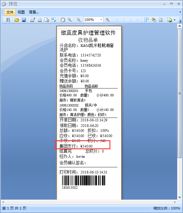 ①結算完成之后,軟件支持打印收衣單或收銀小票,在收衣單中也可以清楚的考到本次會員消費時使用集團卡支付,如圖: