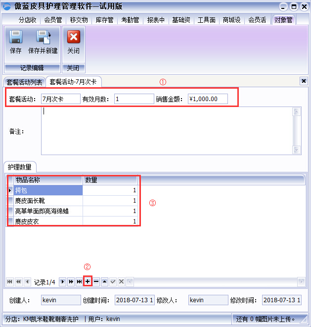 1、皮具護理店套餐活動包括按次卡消費、套裝消費、月卡、年卡消費。套餐活動設置操作,點擊軟件【基礎資料】→【套餐活動】→“新建”套餐活動,進入套餐活動建立頁面,填寫套餐活動的詳細信息,包括活動名稱、有效的月數、銷售金額,在皮具護理數量中點擊“+”添加套餐能可護理的物品名稱和數量,如圖: