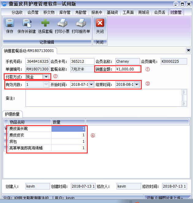 ①選擇好購買的套餐之后,在套餐開單界面可以清晰的看到該套餐包含的具體的護理物品數量和銷售金額,以及該套餐的有效期,選擇付款方式之后,點擊保存,如圖: