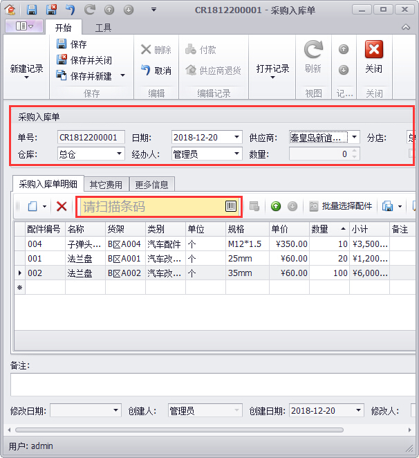 單個(gè)配件產(chǎn)品入庫(kù)支持條碼掃描入庫(kù)