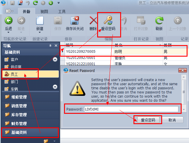 如何查看一個用戶的密碼呢?答案是無法查看,即使是管理員也無法查看。如果您屬下的某個員工忘記了密碼了,那么您可以用您的管理員賬號登陸系統(tǒng),并且在“基礎資料”-“員工”中找到并選中該員工,點擊工具欄的“重設密碼”按鈕,在彈出的重設密碼窗口中輸入新的密碼即可,您也可以先為他設定簡單的密碼,然后讓他登陸后自行重設密碼。