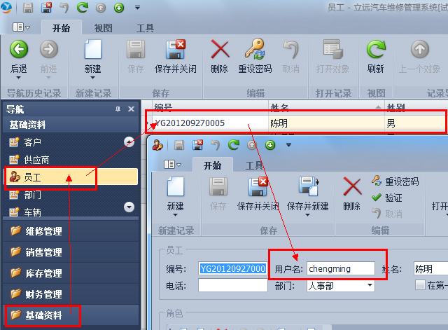 用戶名和密碼是登錄到傲藍汽車維修管理系統(tǒng)的兩把鑰匙,用戶名可以在“基礎資料”-“員工”,雙擊其中一個員工后,在“用戶名”字段中查看得到。