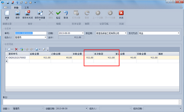 第2步、選中需要收款的供應商退貨單,點擊工具欄的“收款”按鈕,彈出新建供應商退貨收款單界面,此時系統已經根據所選的供應商退貨單填寫好對應的供應商退貨收款單,您只需根據實際需要修改明細中的本次收款的金額即可。
