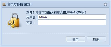 在彈出的登錄窗口中,輸入用戶名和密碼,試用版的用戶名默認(rèn)為admin,密碼為空。點(diǎn)擊“登錄”開始登錄傲藍(lán)物流軟件。