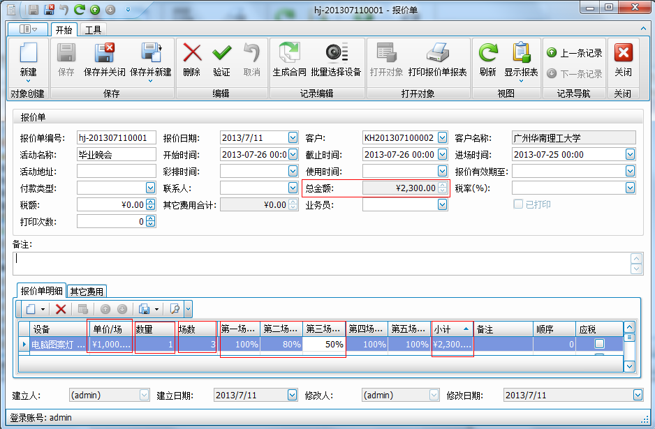 按場收費還可以支持多場按比例進行收費。如下圖所示: